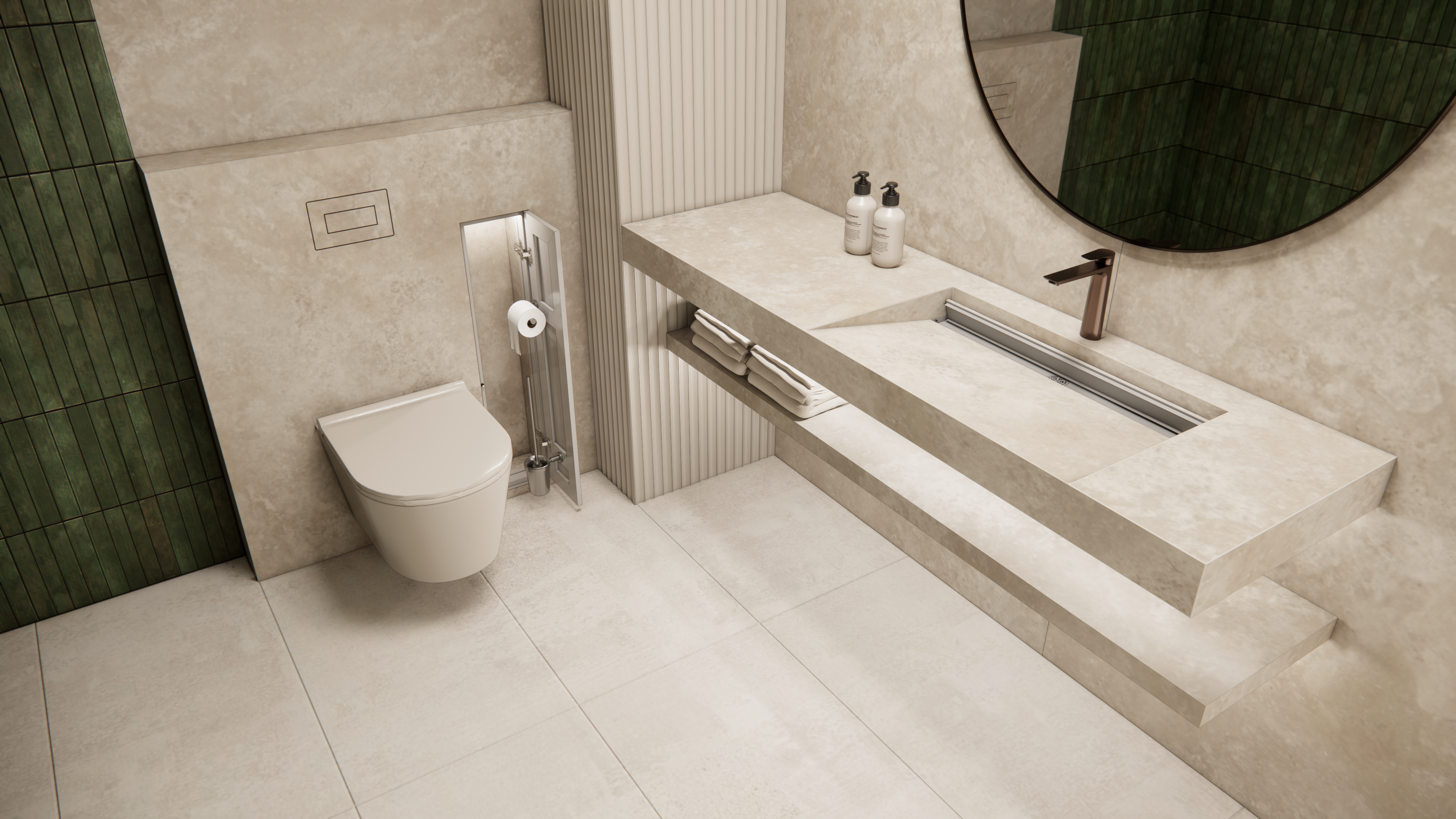 Przemyślana forma ścienna, która w sposób spójny łączy instalację, detal wykończeniowy i ukrytą funkcję przechowywania.